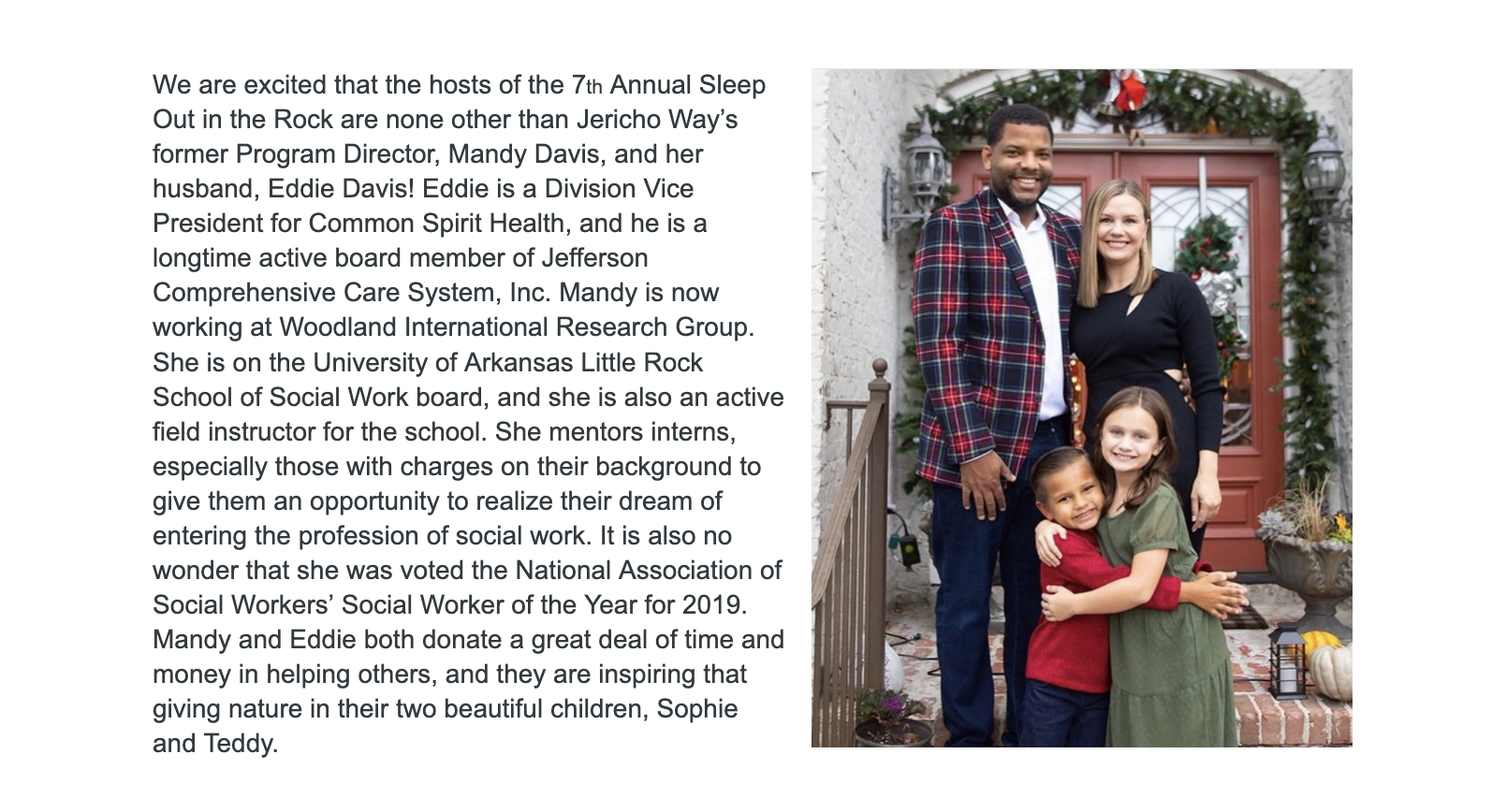The Sleepout in the Rock will be held October 22, 2022, at Murray Park, 5900 Rebsamen Park Rd, 6pm-8am. We hope you will join us in sleeping outside, for one night, in solidarity with those in our community who are unhoused.